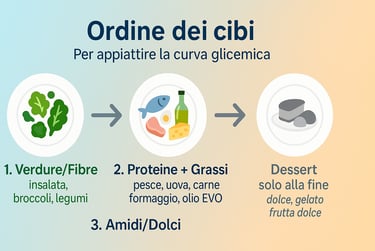 Ordine dei cibi: verdure/fibre → proteine+grassi → amidi/dolci. Il dessert solo alla fine.